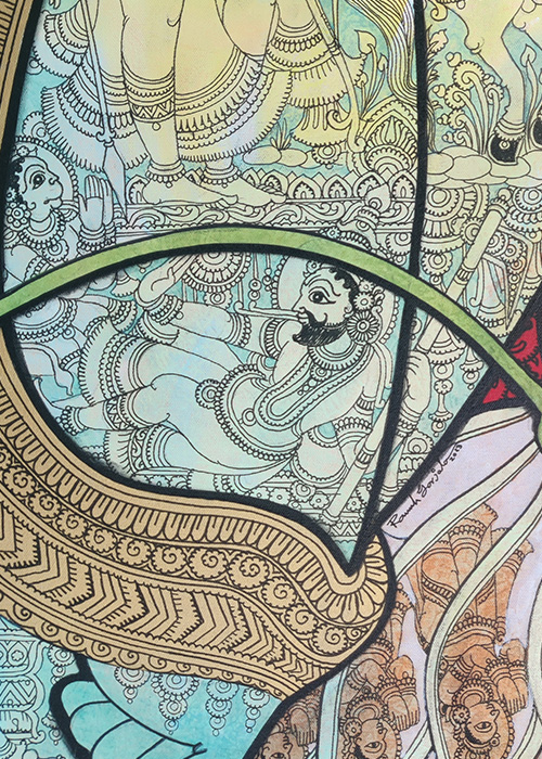 Gorjala’s meticulous attention to detail and his mastery of the Kalamkari technique are evident in his artworks. He uses fine lines, intricate brushwork, and a harmonious color palette to bring his subjects to life. His compositions are carefully structured, and he employs a range of textures and layers to add depth and dimension to his paintings.