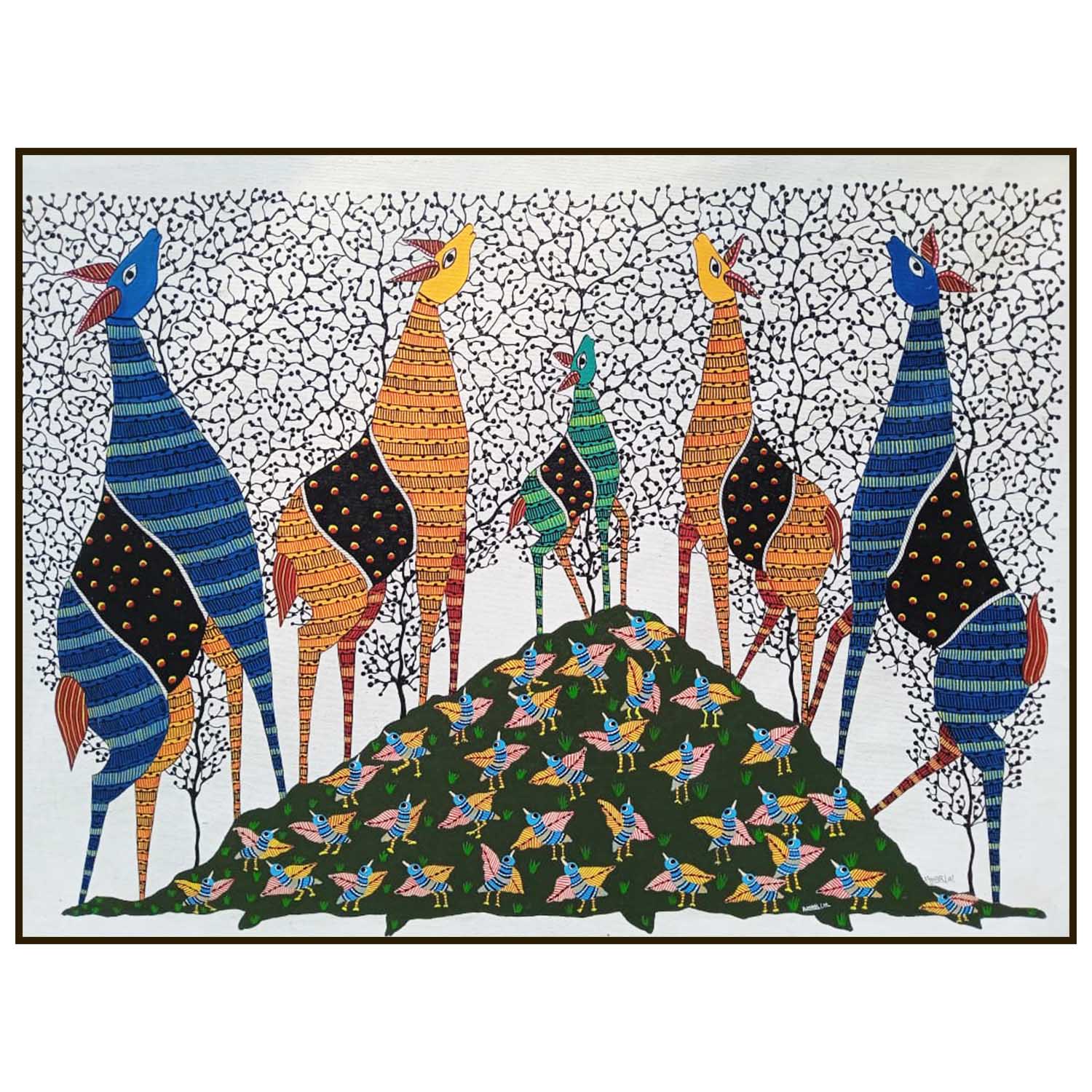 Characterized by its vibrant colors, intricate patterns, and depiction of nature and folklore, Gond art is a unique form of storytelling through visual imagery. Traditionally, it was used to decorate the walls of homes and other surfaces such as floors and courtyards during festivals, weddings, and other auspicious occasions. However, in recent years, it has gained popularity as a standalone art form and is now created on canvas, paper, cloth, and various other mediums.