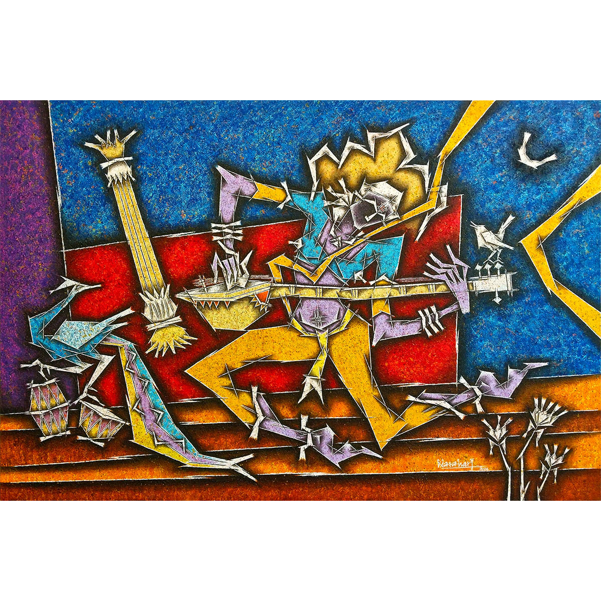 Narahari Punna, a master at capturing the essence of ideal rural life, folklore, mythological representations, and conceptual nudes of women, skilfully communicates the power of women through his unique modern abstract cubism style. His work is distinguished by a vivid palette of brilliant colors and radiates the vibrating energy of lines and shapes, perfectly capturing the spirit of his subjects.