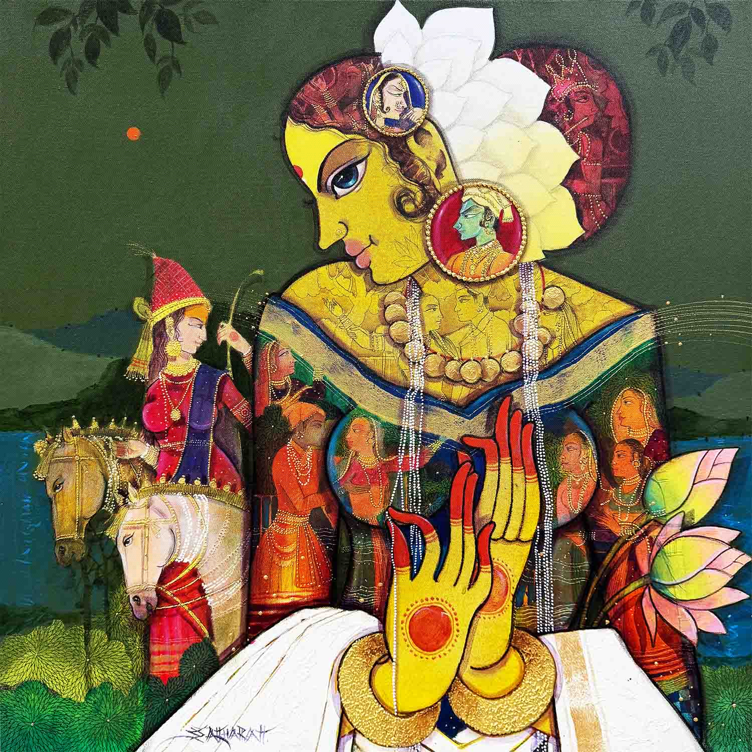 Keeping the eyes, eyebrows, forehead, nose, lips, ears, beauty of hair similar in all paintings, he tries to express the various steps of life. Also the flowers in wreath are same and their colors are different showing her inner expressions.