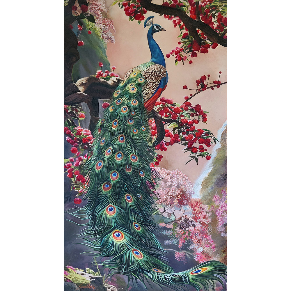 36 x 60 inchesDinkar Jadhav’s dynamic horse paintings radiate energy, freedom, and eternal romance, capturing fleeting moments with bold colors and fluid strokes. His Ashwa Chitramala series symbolizes… -