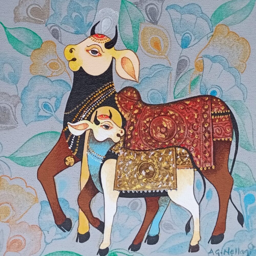 36 x 60 inchesIn all art by Vivek Kumavat, one or multiple Nandis are the central focus of the canvas, tossing their noble heads and joyfully prancing. Their… -